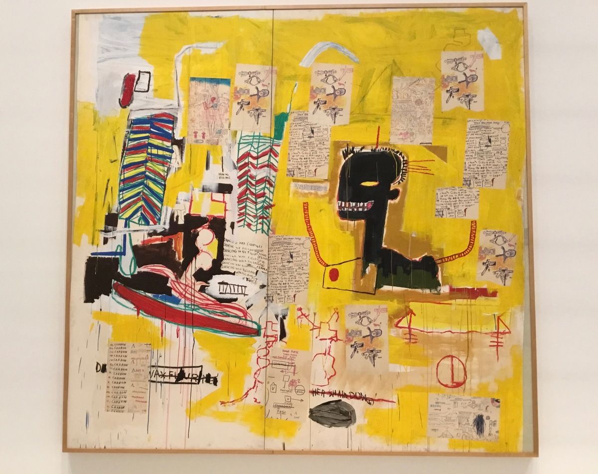 Jean-Michel Basquiat — que j’ai prénommé Jérôme la veille pour je ne sais quelle raison, obscure ou éclairée, ce pour quoi Aymeric m’avait repris —, dont j’ignorais à peu près tout malgré le secours d’émissions radiophoniques ou télévisées venues jusqu’à moi sans aucune investigation de ma part — impose aussi à l’œil ses couleurs et ses grands formats — sans me conquérir toujours tout à fait.
