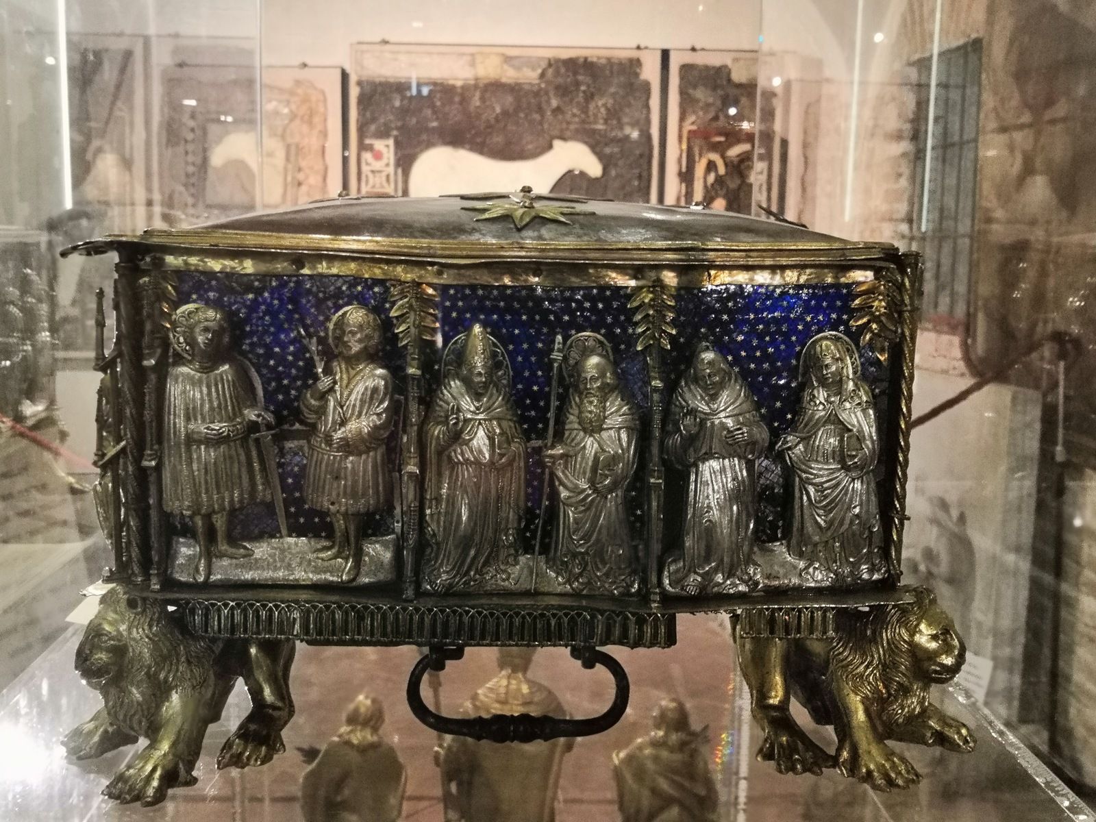 Innocents’ Urn, Front : Scenes from the life of the Christ Child ; Sides : Franciscan and milanese Saints. Embossed silver on blue enameled back, Lombard Gold-work, 1449.